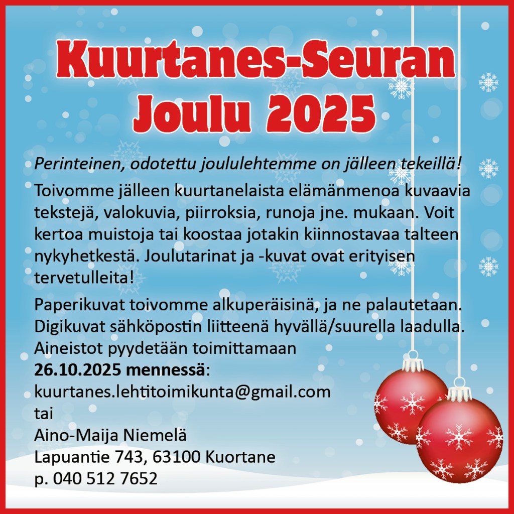 Aineistot pyydämme toimittamaan 26.10.2025 mennessä: kuurtanes.lehtitoimikunta@gmail.com tai Aino-Maija Niemelä Lapuantie 743, 63100 Kuortane.
